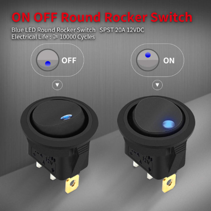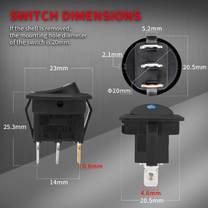 Function: The round rocker switch has 3 pins, and SPST (single pole single throw) design with a set of jumpers, easy to turn ON/ OFF. The rating is 20A 12VDC.