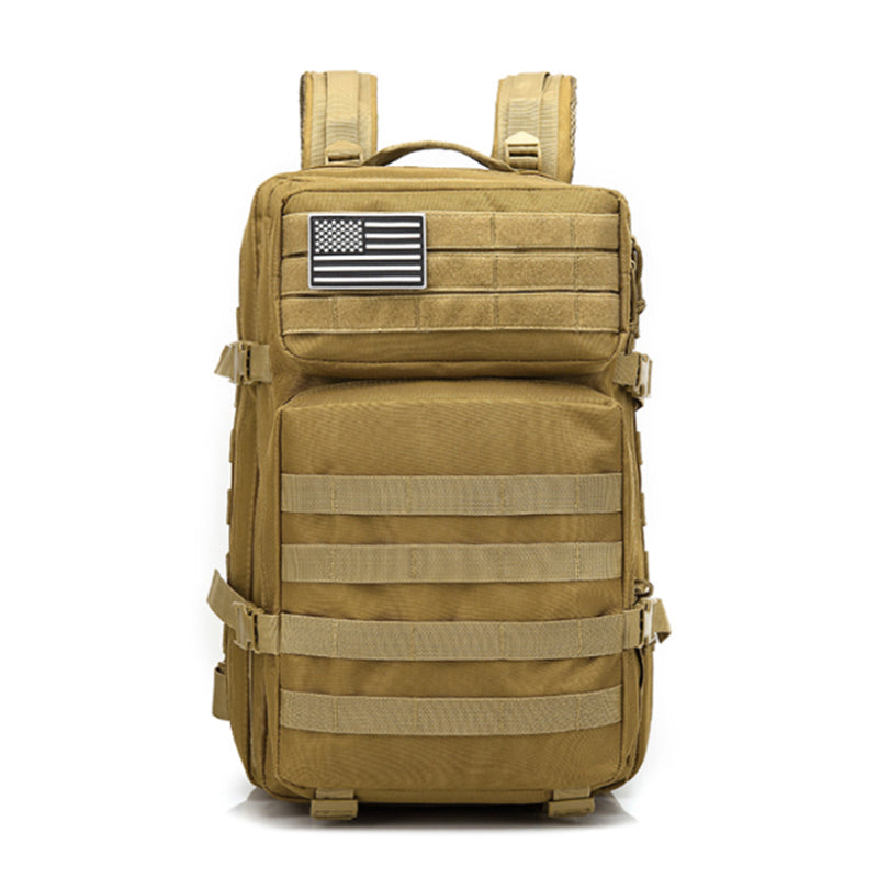 Military Tactical backpack size approx.: 30*50*30CM (W*H*D), Capacity: 45L; Military backpack is made of high density fabric--durable and water-resistant