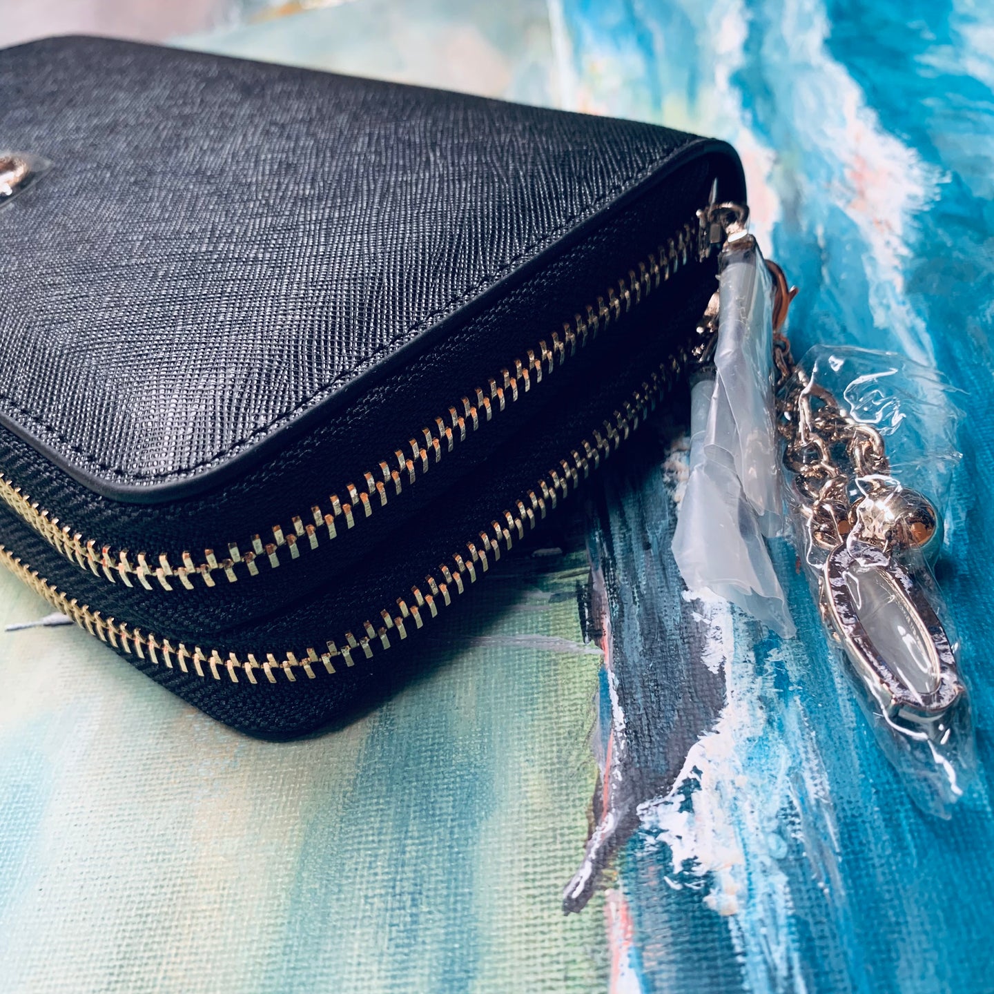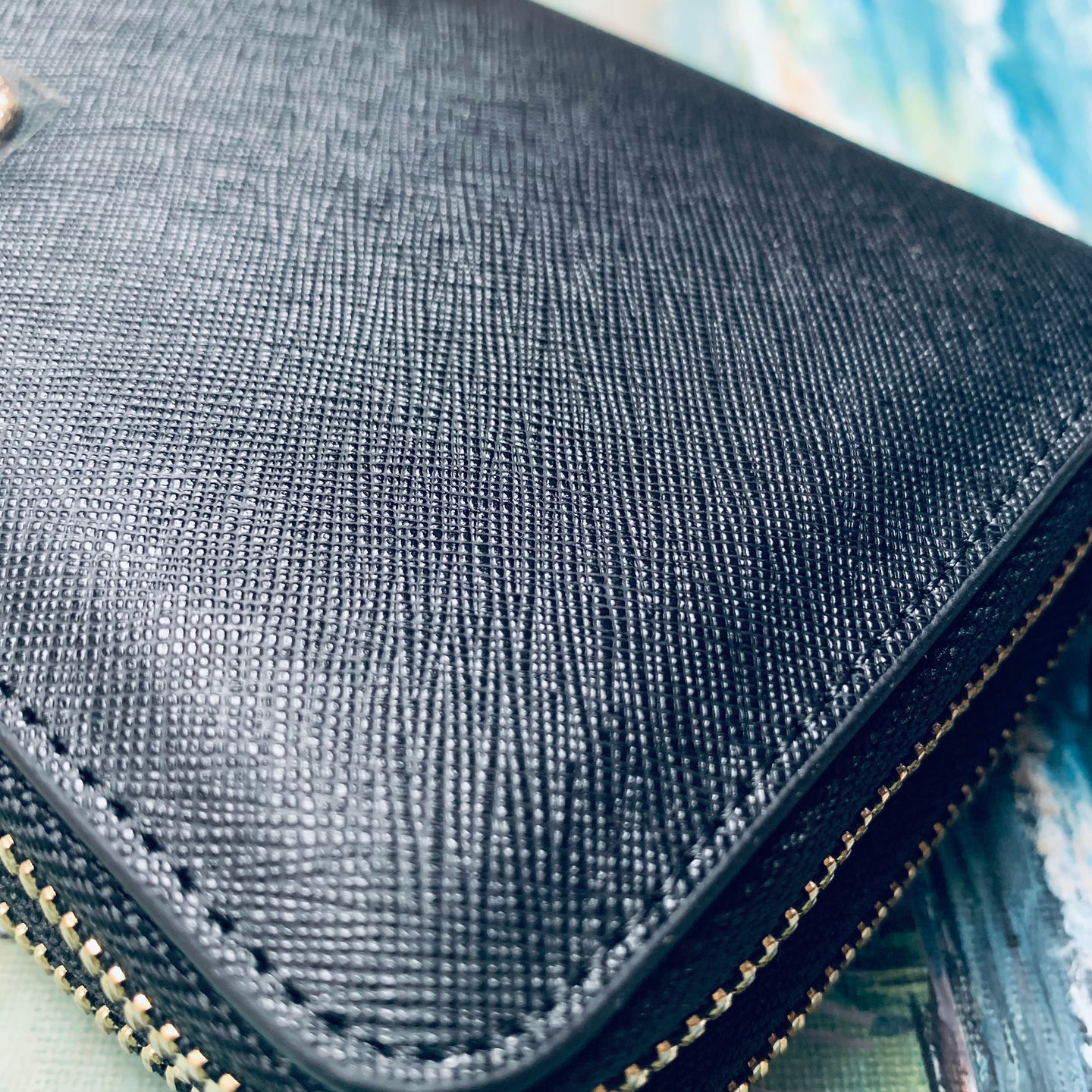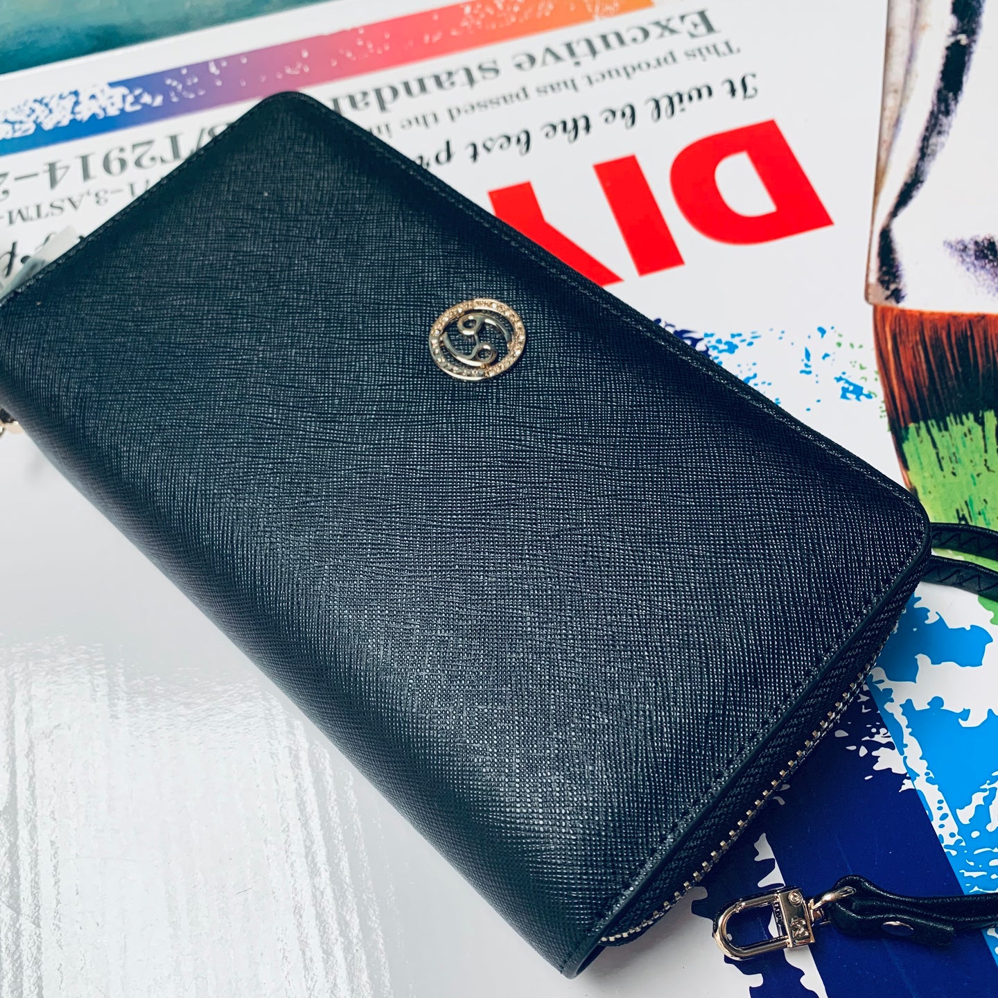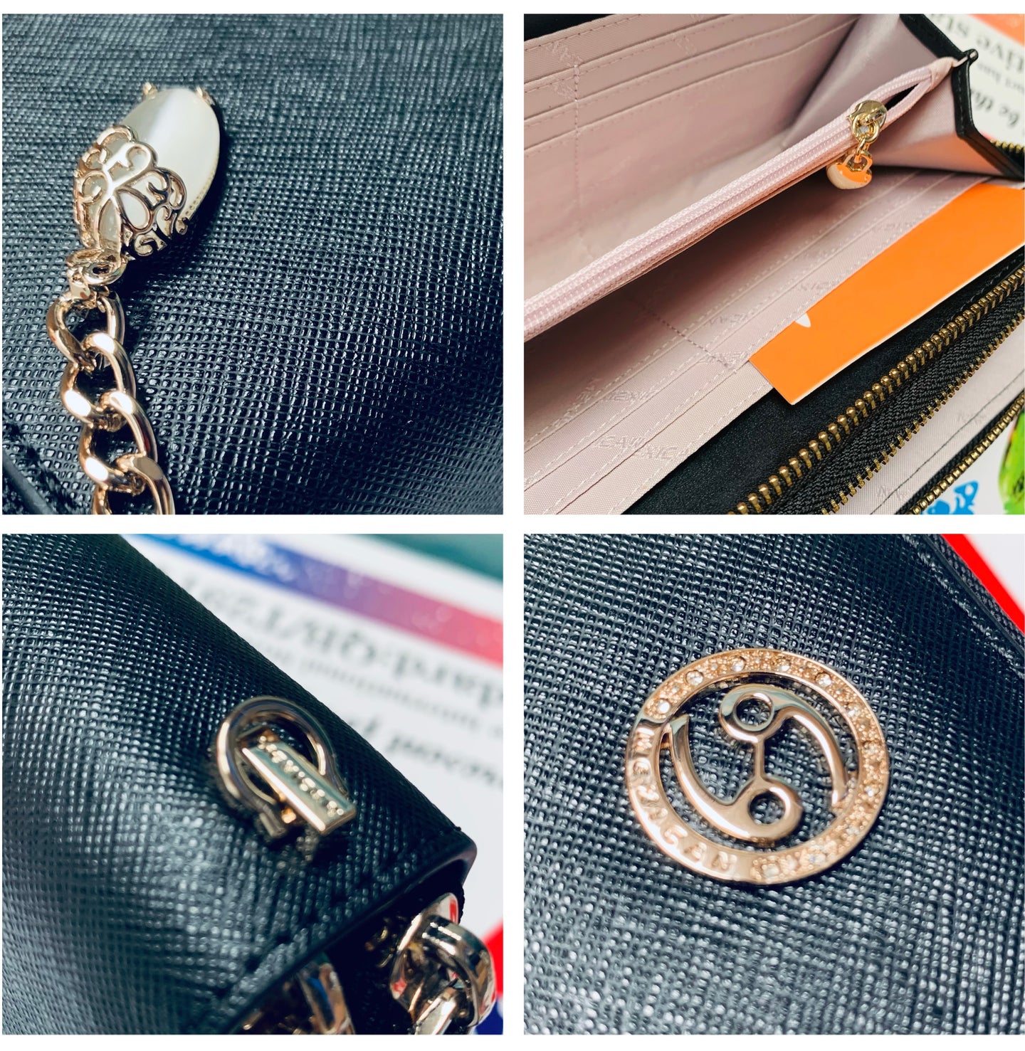 *it has 12 card slots, 4 compartments, 1 zipper pocket, and 1 removable leather wristlet strap.