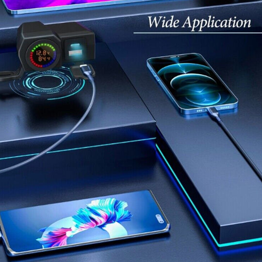 Dual USB PD Motorcycle Phone Charger LED Voltmeter Temperature for Handlebar