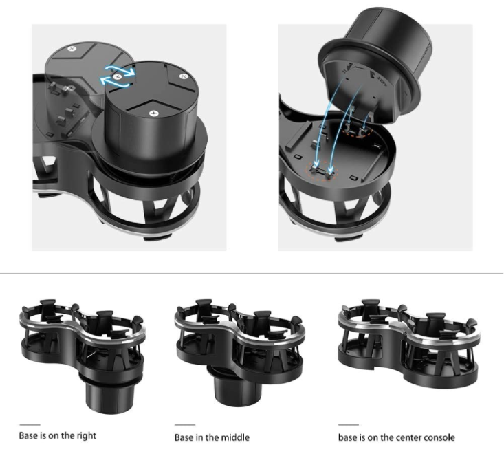 Just twist the top of the adapter to expand or retract the base.3 Installation Methods. The adjustable base can be installed in the middle/on the left/on the right of the product, even be Stick On The Instrument Panel(SEE PRODUCT DESCRIPTION TO MAKE SURE THE ADAPTER WILL FIT YOUR VEHICLES CUP HOLDERS)