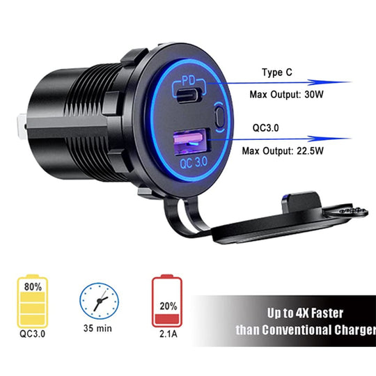 [ Type C and QC3.0 USB car port] The most Advanced Type C Power Delivery 2.0 waterproof socket technology provides a blazing-fast charge to USB-C devices, while Qualcomm Quick Charge 3.0 technology provides a charge speed...Regular price $22.99