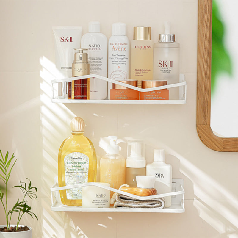 The shelf can be installed with either a no-mark adhesive or drilling (we provide 2 extra adhesives). Bathroom shelves fit nearly any indoor wall surface and can meet your different needs, ideal for living rooms, kitchens, dorms, RV, tool rooms.