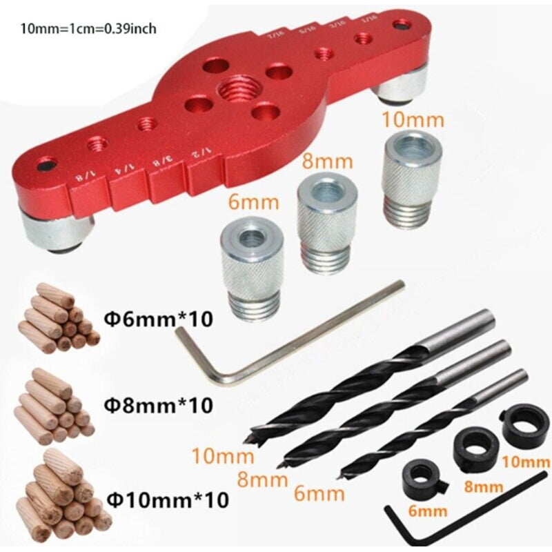 42pcs includes: one positioner, 6mm, 8mm, 10mm guide nut, three-point twist drill, one drill bit limit ring, two L small spanners, 10 wooden tenons each of 6mm, 8mm, 10mm.
