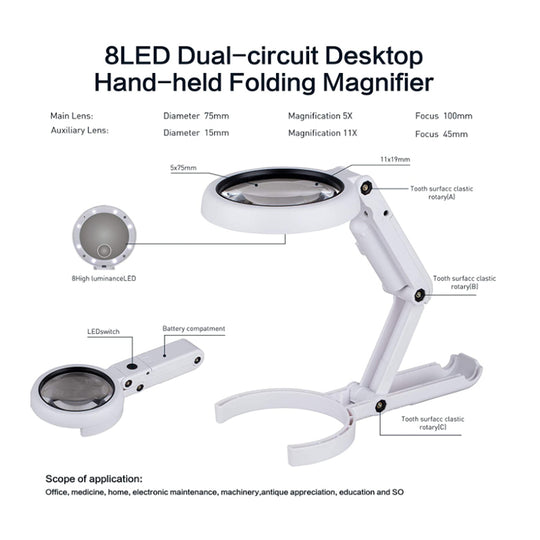 Desktop Hand-held Folding 2 in 1 Magnifier with 8 LED - 5X Lighted USB Charging