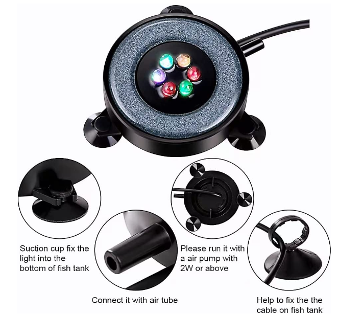 The fish bubbler provide little fun for your fishes with it’s colourful light and air bubbles, the intensity of the bubbles is determined by the volume and pressure output of your pump