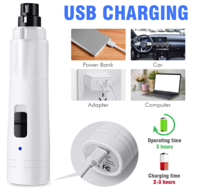 The cordless dog nail grinder boasts Ni-MH battery that lasts 5 hours after a 2-hour charge. And our electric pet nail grinder is lightweight and portable, which makes it easy to maneuver the grinder to every corner of the paw.