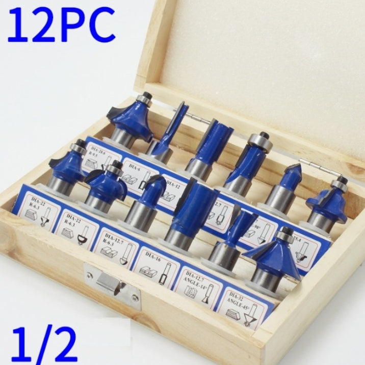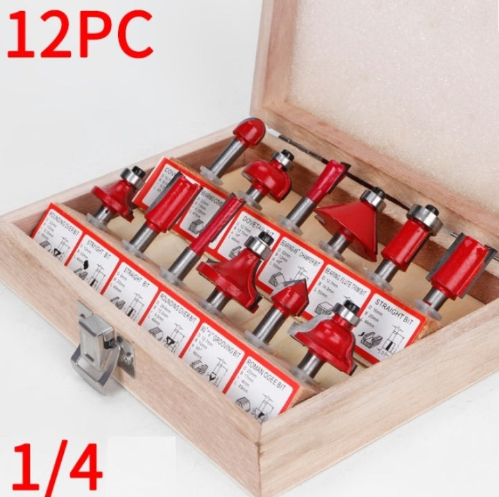 12pcs Router Bit Set(1/4 inch shank) include : Straight Bit: D1/4 inch,D1/2 inch,D5/8 inch; 90 degree V inchGrooving Bit: D1/2 inch; Dovetail Bit:D1/2 inch; 45-degree Chamfer Bit: B1/2 inch; Flush Trim Bit:D1/2 inch; Cove Box Bit: R1/2 inch; Round Over Bit: R1/4 inch, R3/8 inch; Cove Box Bit: R1/4 inch; Roman Ogee Bit: R5/32 inch