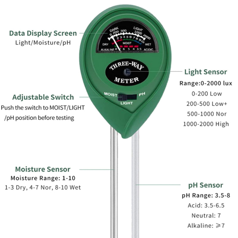 • 3-in-1 FUNCTION: This specially designed soil test kit can test soil moisture, pH value and sunlight level of plants , quickly helps you to know the soil condition and do adjustment for better plants care.
