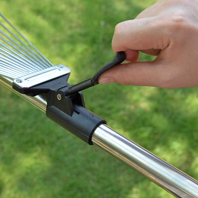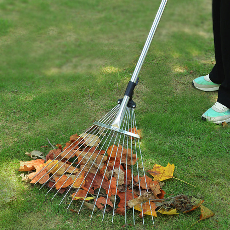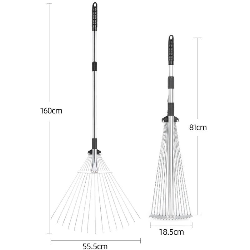 Telescopic & Adjustable: The 15-tine rake head can expand from18.5cm to 55.5cm in width and the whole rack can expand from 81cm to 160cm; The telescopic handle of the metal rake can also be extended to retracted to reduce back bending and fatigue