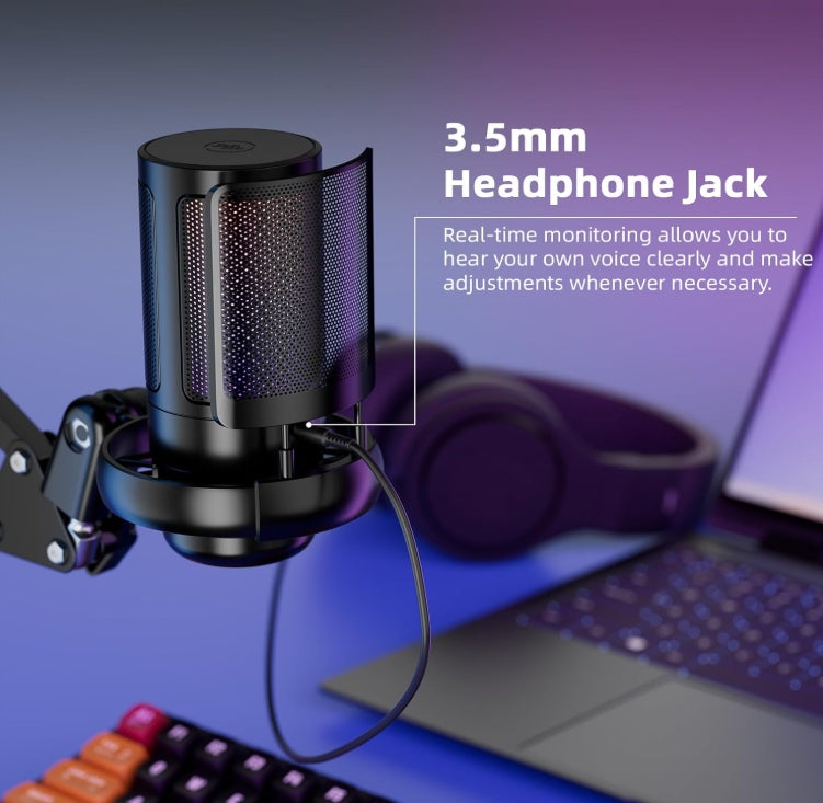 - Featuring a touch-sensitive mute sensor, you can easily mute the microphone with a simple touch, and the RGB light will turn off to signal that the mic is muted. The rotary volume control knob at the base allows for effortless volume adjustments. A built-in 3.5mm headphone jack enables real-time voice monitoring, ensuring superior recording quality.