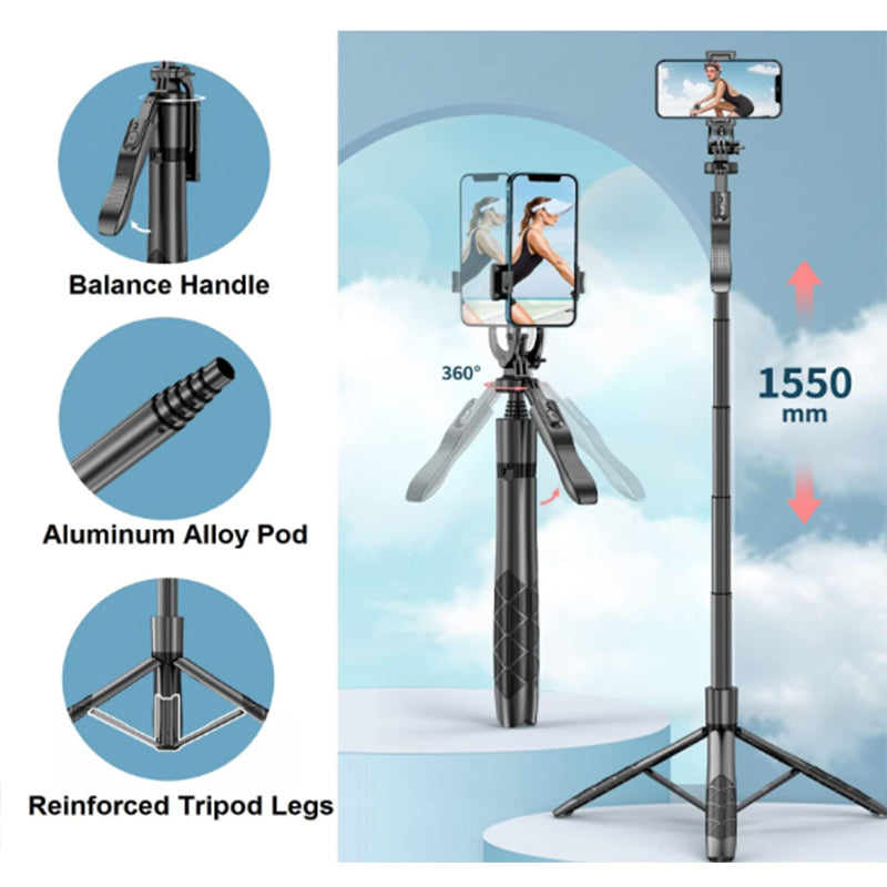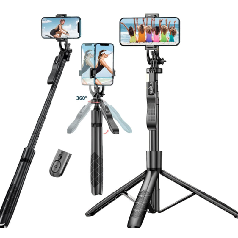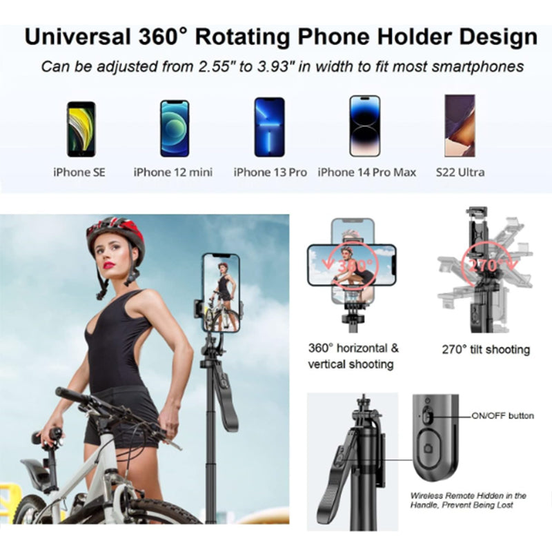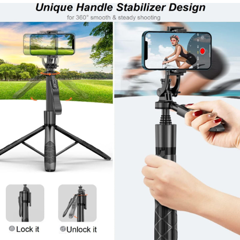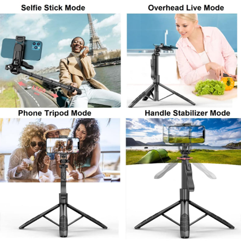 Combine the functions of selfie stick, phone tripod stand and handheld stabilizer in one, it is designed with 360° smooth rotating head, embedded wireless remote, built-in hidden tripod legs, and reinforced tripod base with non-slip silicone foot pads. Perfect for selfies & group photos, vlogging, live streaming, video recording, adventure travel, etc.