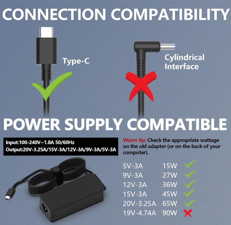 Input Volt Range: 100-240V; Output: 20V 3.25A 65W(Compatible with 45W, 36W, 27W , 15W); Connector: USB-C (Type-C) Can charge most mobile phones, laptops and tablets that support USB C interface.
