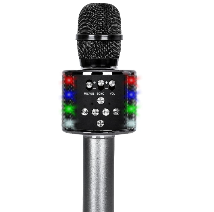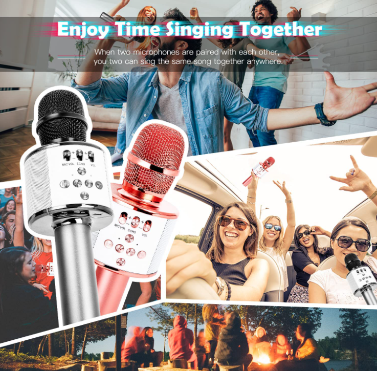 It's a magic bluetooth mic for voice-changing. There are five sound modes: original sound, children's voice, female voice, male voice, old male voice, bringing more fun for girls boys adults all age. Build-in 4 different color 48 LED lights, flash with music change when singing, creating a great atmosphere and making the party more fun.