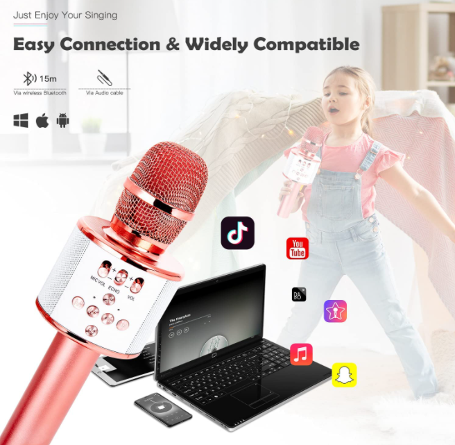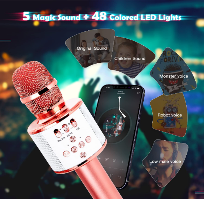 It's a magic bluetooth mic for voice-changing. There are five sound modes: original sound, children's voice, female voice, male voice, old male voice, bringing more fun for girls boys adults all age. Build-in 4 different color 48 LED lights, flash with music change when singing, creating a great atmosphere and making the party more fun.