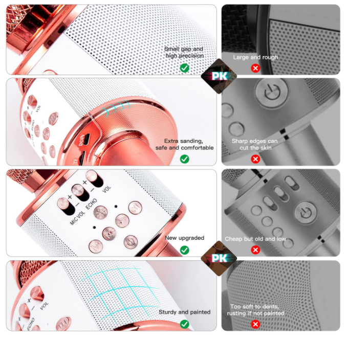 Karaoke Microphone--Wireless Bluetooth connection, singing karaoke anywhere anytime; Bluetooth speaker--open the mobile APP, you can play music; Loudspeaker--One key to turn on, you can amplify your voice without connecting anything; Recorder--recording growth and happy times; Radio model--As long as the surrounding signal is strong enough, the radio function can be activated at any time. Selfie shutter--record the beauty of the world together.