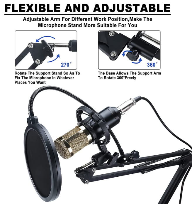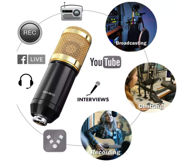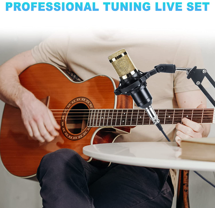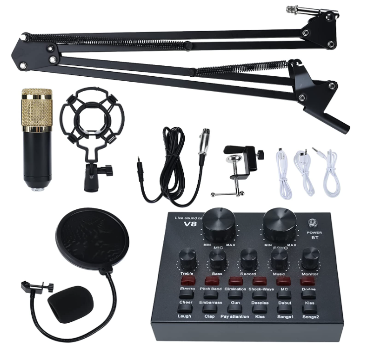 Equipped with ALPOWL BM-800 microphone, Shock mount, Pop filter, Mic adjustable suspension scissor arm stand, Anti-wind foam Cap, Power cable, ALPOWL Live sound card.
