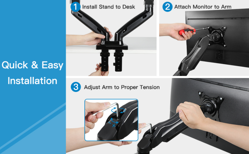 Easy to Install - Don’t worry about having to call your coworker or your friends for help - our Dual Monitor Stands are designed so they can be easily installed by yourself in less than 5 minutes. The Dual Monitor Mount sets up easily and can be attached to your screen in two different ways, either by desk clamp (up to 85mm thick) or by grommet (20-60mm wide and up to 80mm thick).