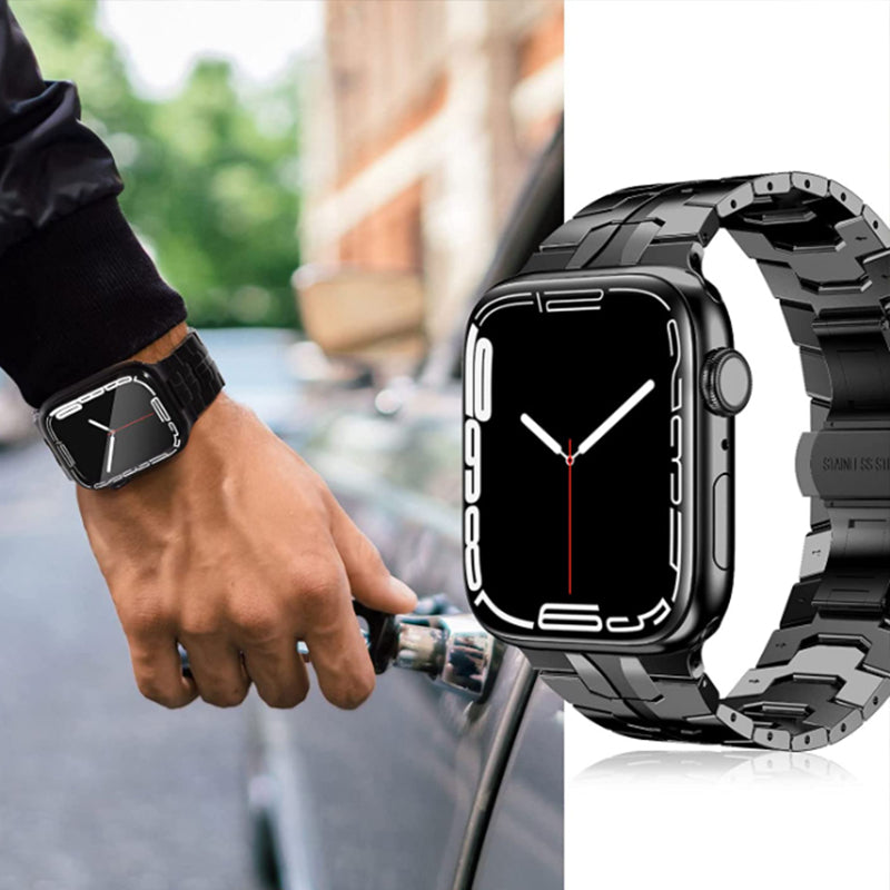There are two sizes can choose from. One size is for 42mm, 44mm, 45mm and 49mm. The other size is for 38mm, 40mm and 41mm. The length is adjustable. Fits 5.5”-9.1” (140-230mm) wrists, you can keep the original length or adjust it by adding and taking away links to suit you.