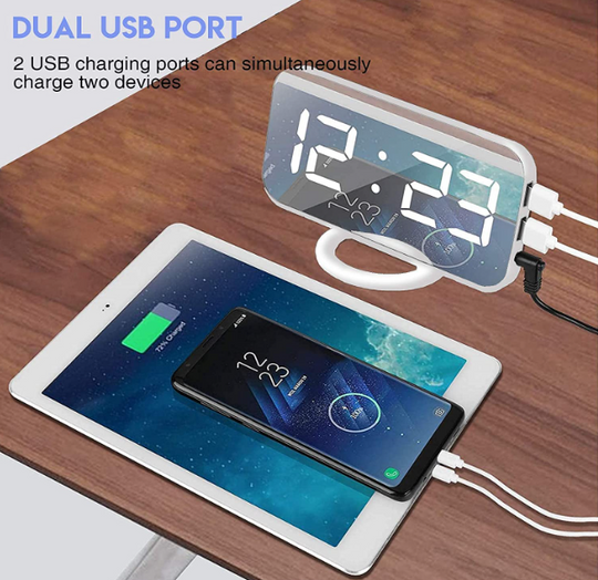 Digital Alarm Clock, 6.6" Large Mirrored LED Clock with Dual USB Charger Ports W