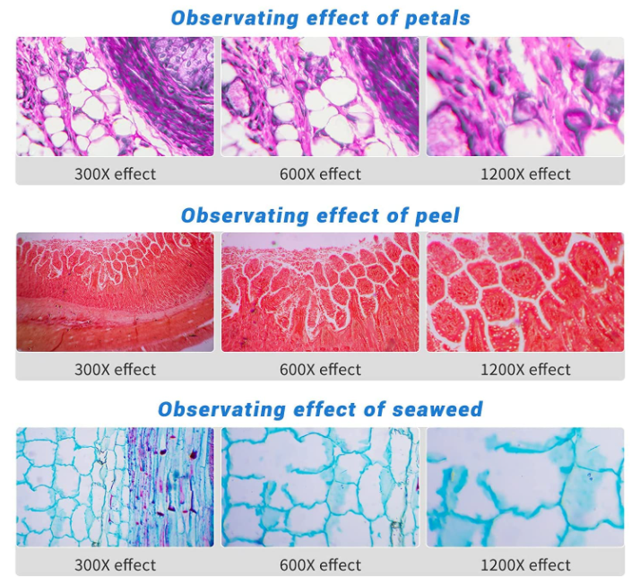 Special Design: This microscope can have a high magnification of 300X-600X-1200X, with 7 colors of filter lenses and LED lights at the bottom, can provide clear enough pictures and details.