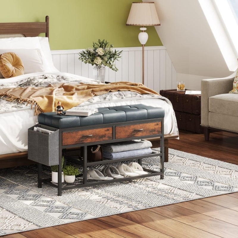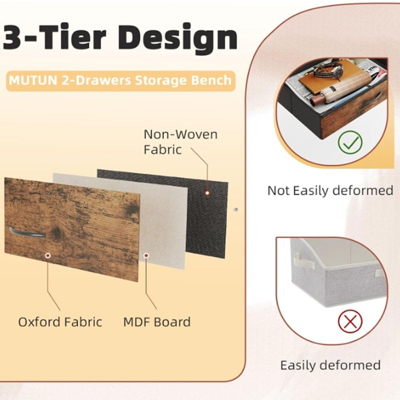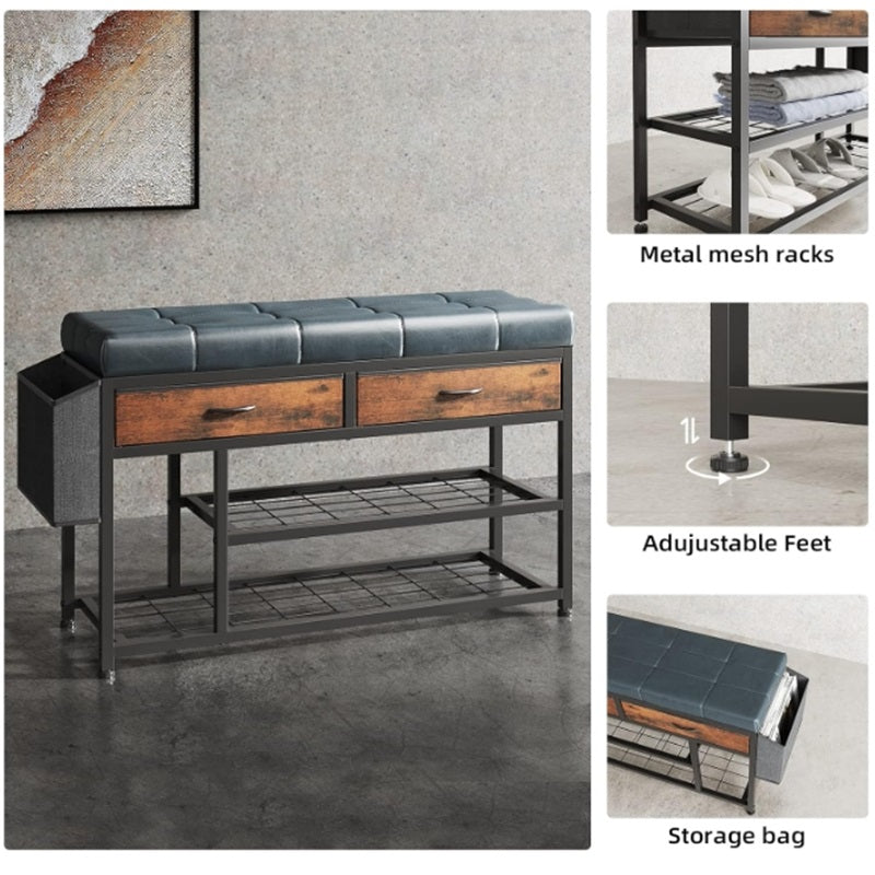 2 hidden storage Drawer and side storage bag of the bench helps you store small items, such as shoe cream, socks, wallets, gloves, hats, purses, bags and keys. 2 adjustable feet are designed for easy leveling on uneven floors and protect floors from scratches.