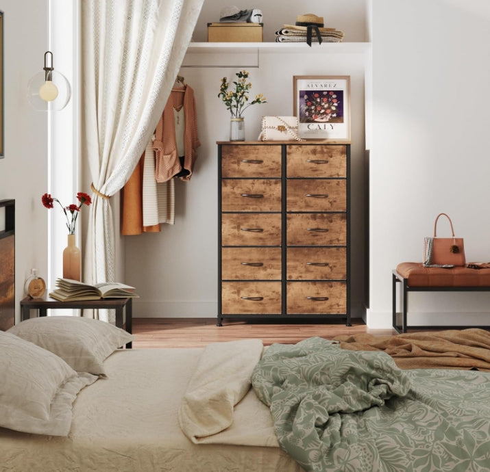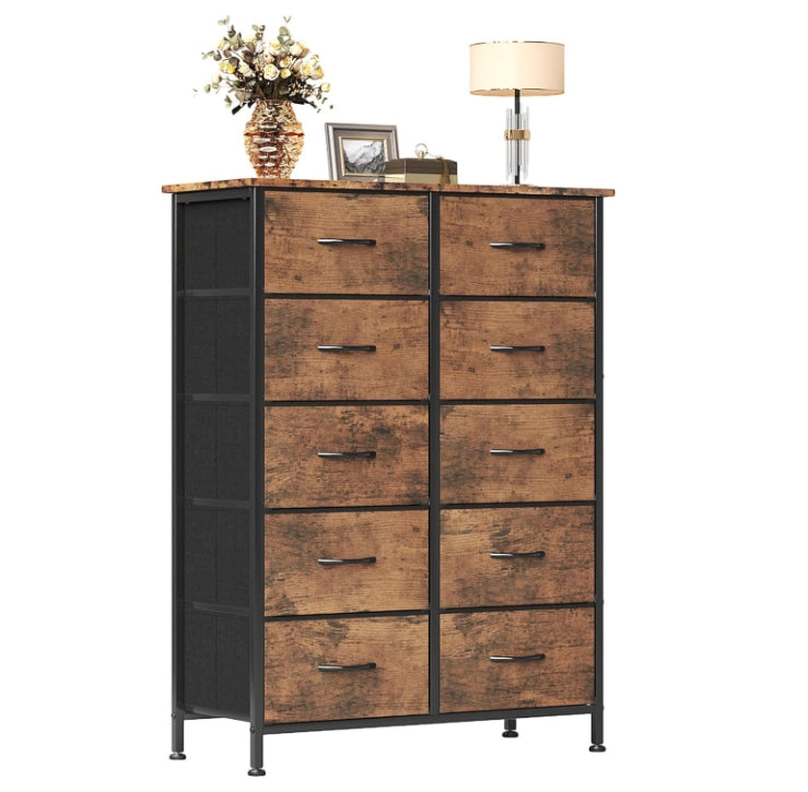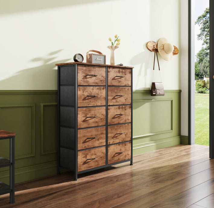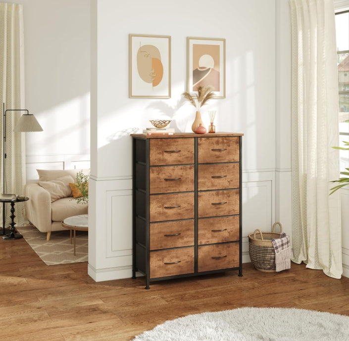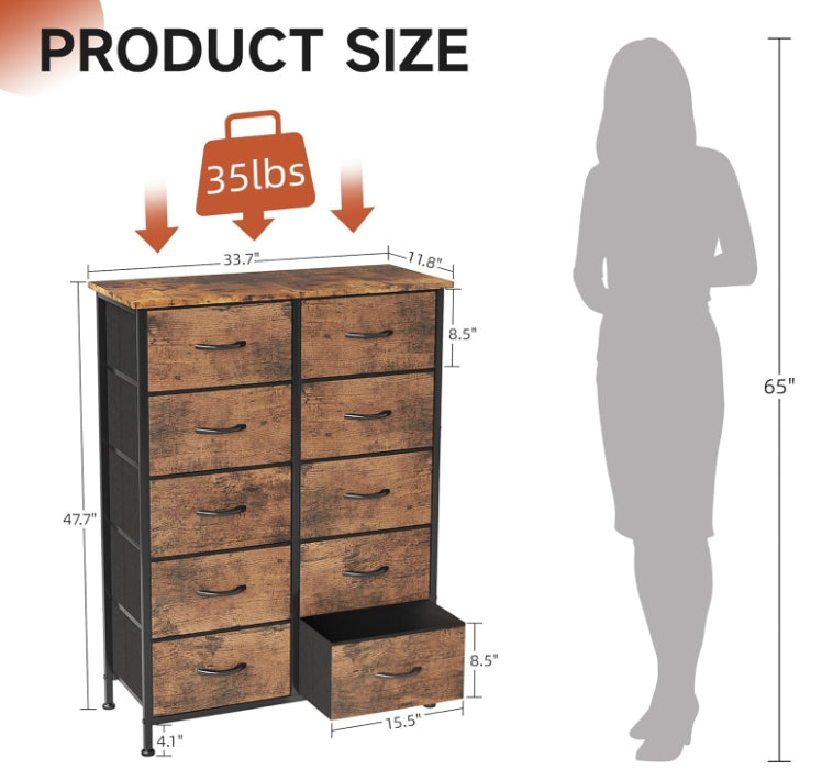 The tall 5-Tier drawers are made of sturdy metal frame and durable wooden waterproof tabletop. The 10 removable drawers with easy-to-pull wooden handles. The strong steel frame enhances product stability and load capacity. 4 adjustable feet protect the floor from scratches and fit for uneven floors.