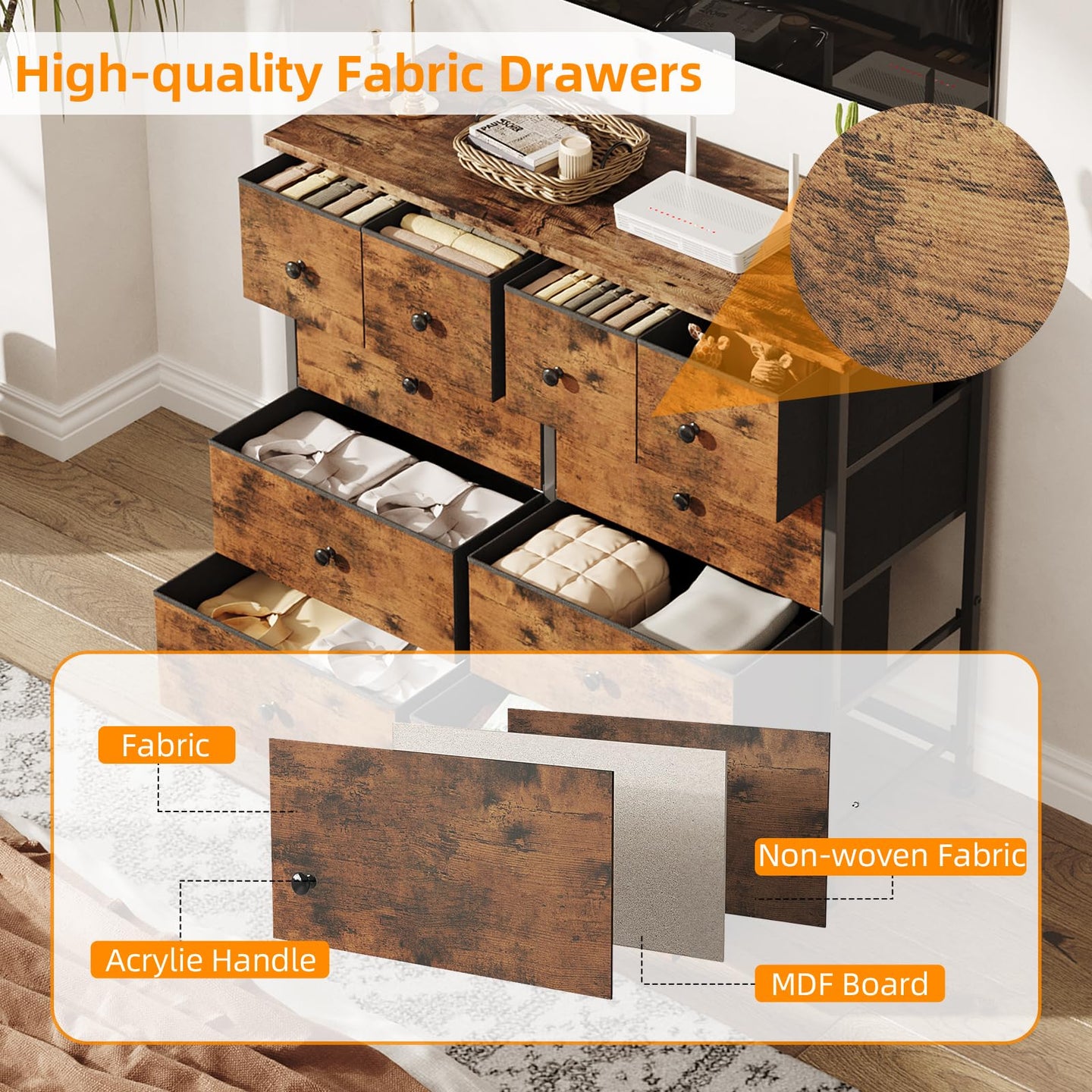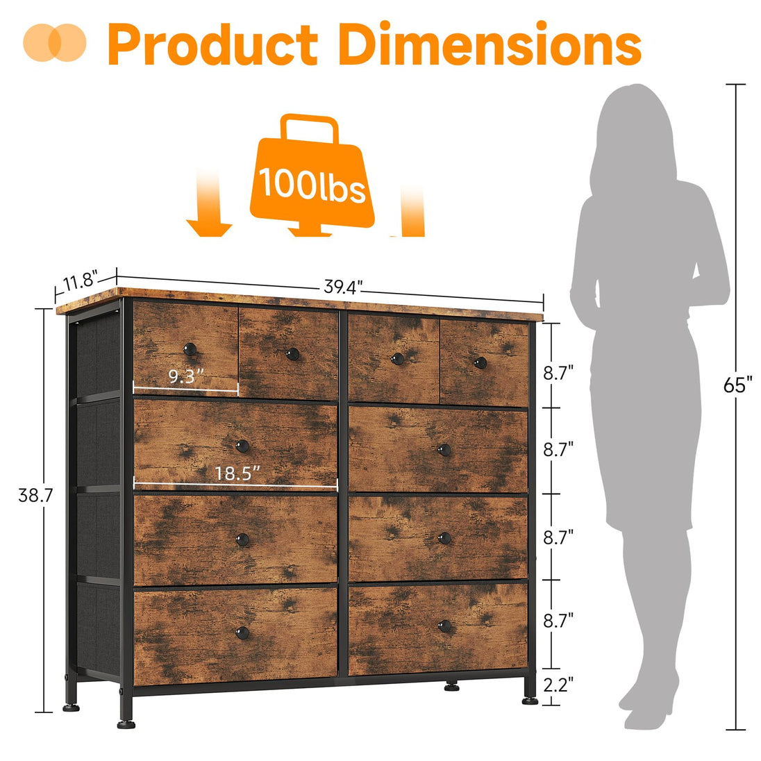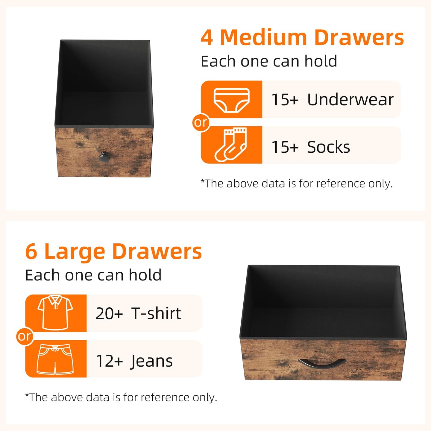 The tall 10 drawers dresser are made of sturdy metal frame and durable MDF waterproof tabletop. The 10 removable drawers with easy-to-pull handles. The strong steel frame enhances product stability and load capacity.