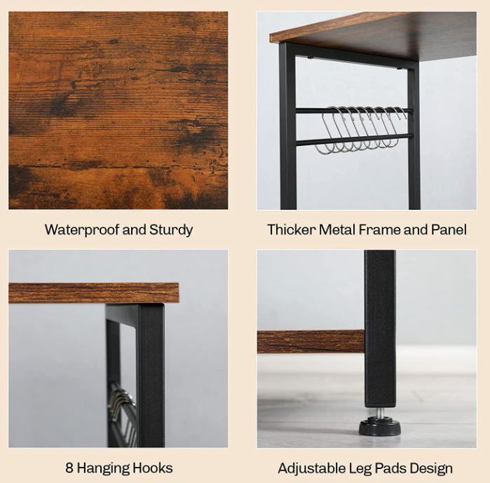 The kitchen island cart with adjustable legs at the bottom keep everything in place even on uneven floors.