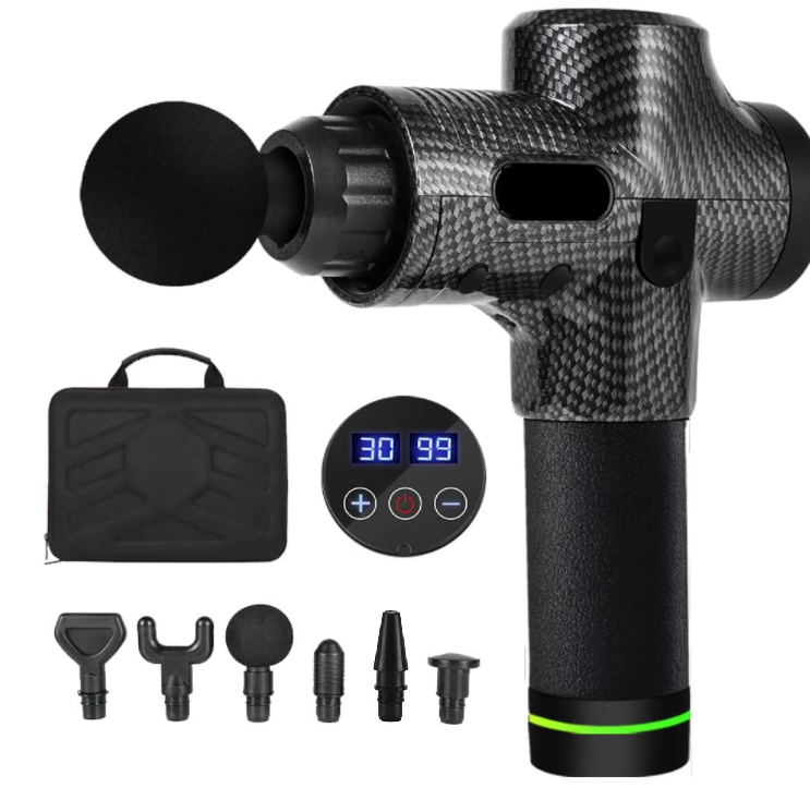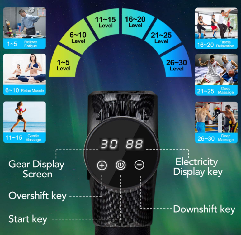 CORDLESS RECHARGEABLE MASSAGE GUN -The Muscle massager gun is equipped with 2500 mAh high-quality lithium battery which can keep working about 8 -10 hours (low speed), The massager gun with LCD touch screen display shows speed level and power indicator so you don't have to worry about power outages.A nice carry case is included, so you can take the massagers for muscles anywhere easily.