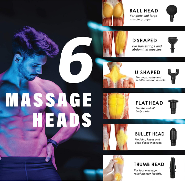 6 MASSAGE HEADS + 30 SPEED LEVELS – The deep tissue massage gun comes with 6 different massager heads to aid in sore muscle relief,30 Adjustable speed mode,Choose the speed and massager heads that best suits your needs (1,200 to 3,300 pulses per minute) to more precisely target different body parts and muscle groups, Incorporate a low to high pressure percussive massage experience into your rapid recovery routine. really reduce muscle recovery time, and relieve pain from head to toe