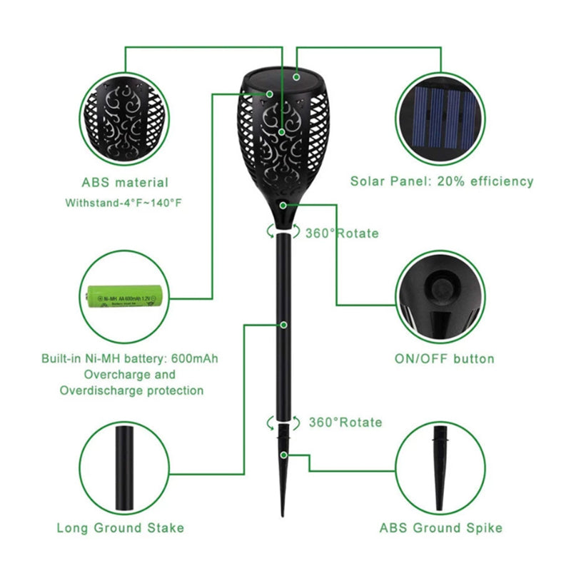 DANCING FLAMES OUTDOOR TORCHES: This outdoor solar torches flickering lights is a safe alternative to the real “flames” with 96LEDs inside,