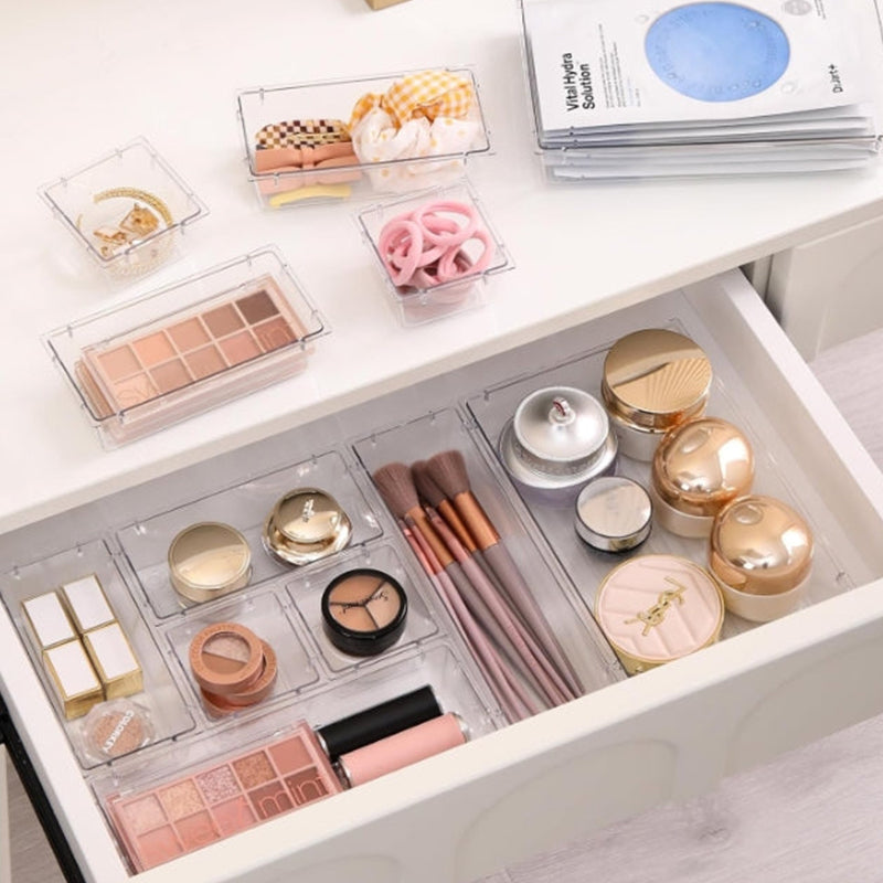 APPLICATION: The clear plastic drawer organizers set is suitable for Makeup, Jewelries, Gadgets, Bathroom, Office, Bedroom, etc. Whenever you have a messy stack of items, you can use our storage boxes to optimize your space planning.