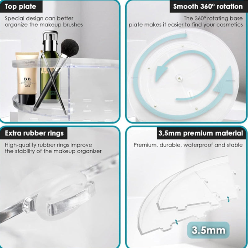 Steady base ensures that cosmetics stay in place when the cosmetic organizer is rotated; thick and durable trays are strong enough to bear even heavy products.