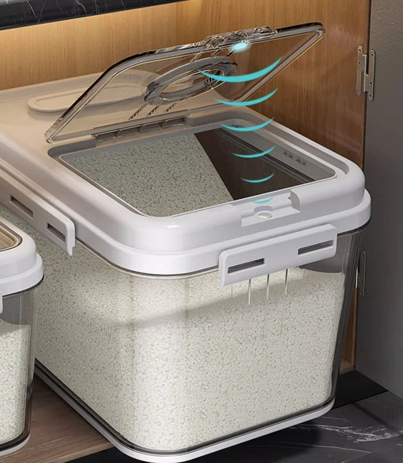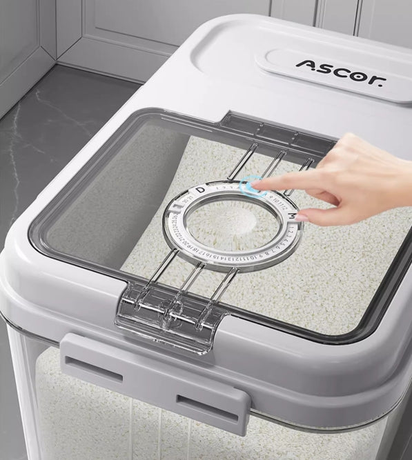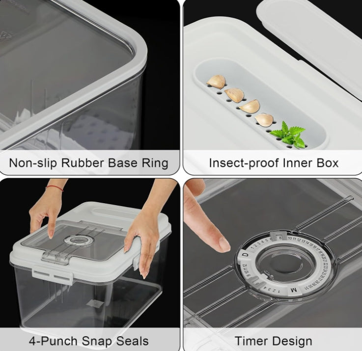 These food storage containers for kitchen are made from high-quality plastic materials with solid structure that are built to last,ensuring that it will have large capacity of 15kg withstanding regular use and remaining in great condition over time;The rotating timer on the flap can be freely set to conveniently record the last use time or current use time of food such as rice or flour.The bottom has a non-slip rubber base ring which can increase the friction, not easily shifted and does not scratch the countertop.