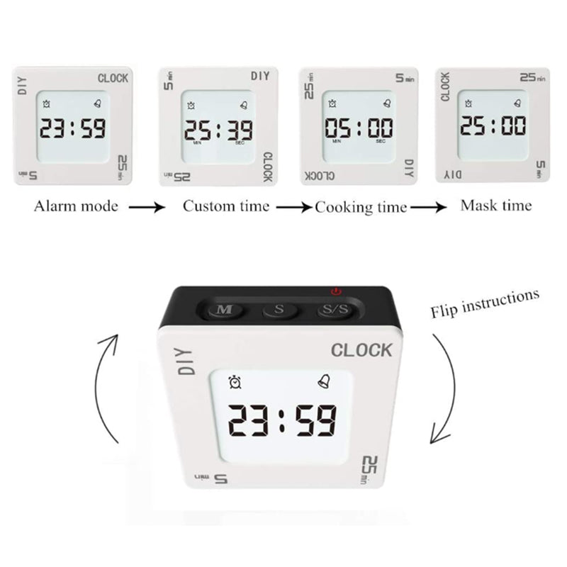 Easy to use, four-sided flip display, clockwise flip clock, DIY custom any minute timer, 5-minute timer, 25-minute timer, all timing start or pause is realized by shaking the product, no button operation in the whole process, free Go to your tedious setup time