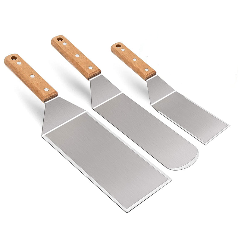 HEAVY DUTY, griddle spatula blade is made from food grade solid stainless steel, which is up to 1.5mm thick, ergonomic and comfortable handle is fixed with triple rivets, more durable and stronger