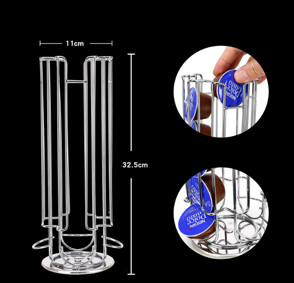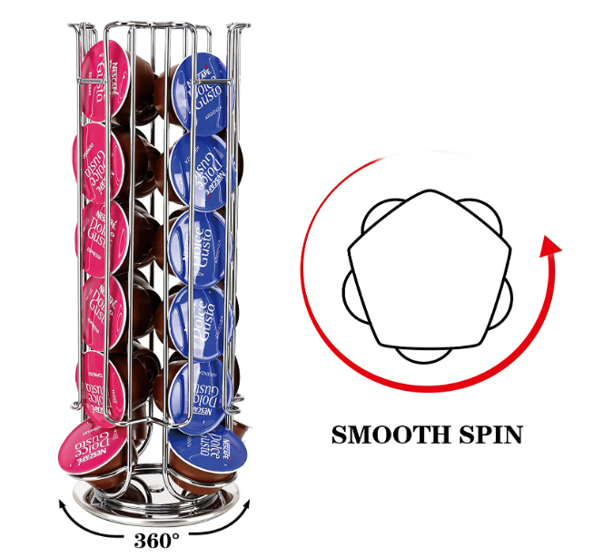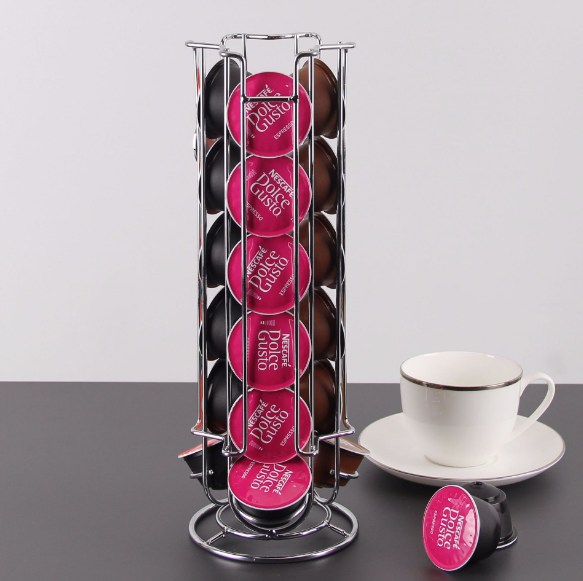It works perfectly in any home or office setting.Sturdy construction will not topple under the weight of multiple capsules.Can store up to 24 Dolce Gusto coffee pods,you can fill it easily.