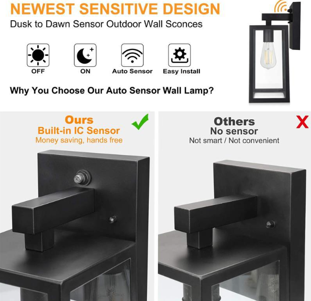 The sensor can better sense the subtle changes of surrounding brightness, realize the intelligent switch of the lantern. Light OFF from sunrise to dusk, ON from sunset to dawn, so that you can really feel the warmness when come home at night. The outdoor porch light provides not only an automated solution for your lighting, but also an energy saving lifestyle. The exterior lantern liberates your hands and bring you a convenient and smart life.