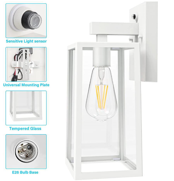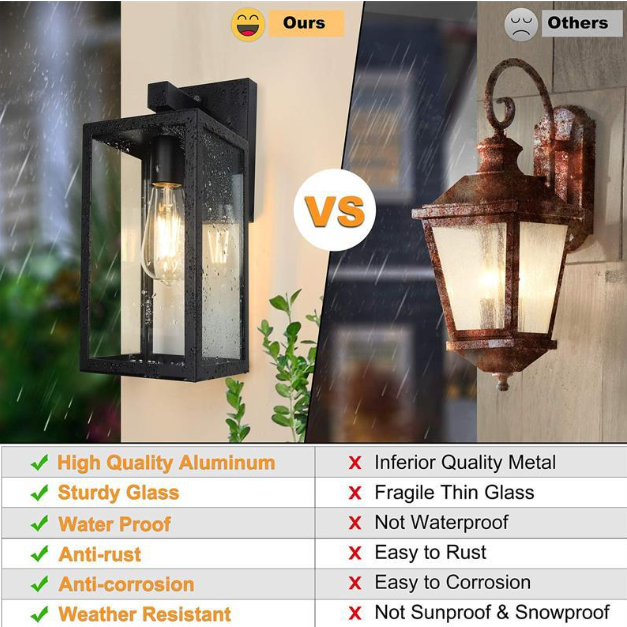 Specially designed for outdoor, The dusk to dawn wall sconces are made of high-quality aluminum alloy and adopt die-casting process to effectively prevent rust and corrosion. Even in severe weather their quality and stability are still trustworthy. The tight installation of the precisely cut glass and aluminum alloy frame creates a perfect confined space, which has passed strict waterproof tests.