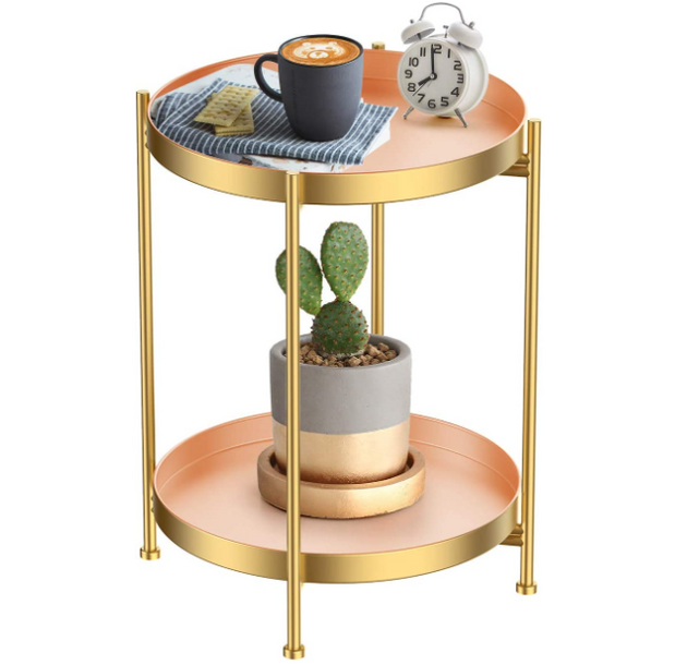 Folding End Table 2-Tier Metal Round Side Table with Removable Tray Gold + Pink