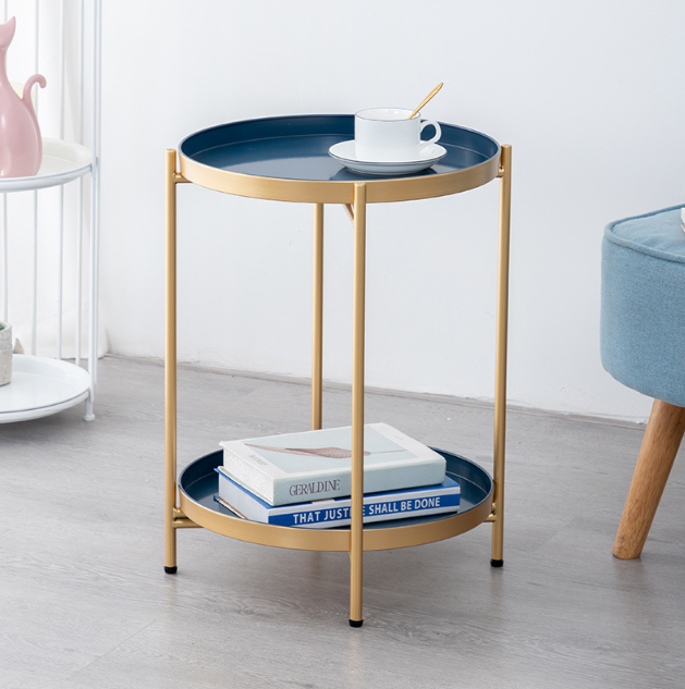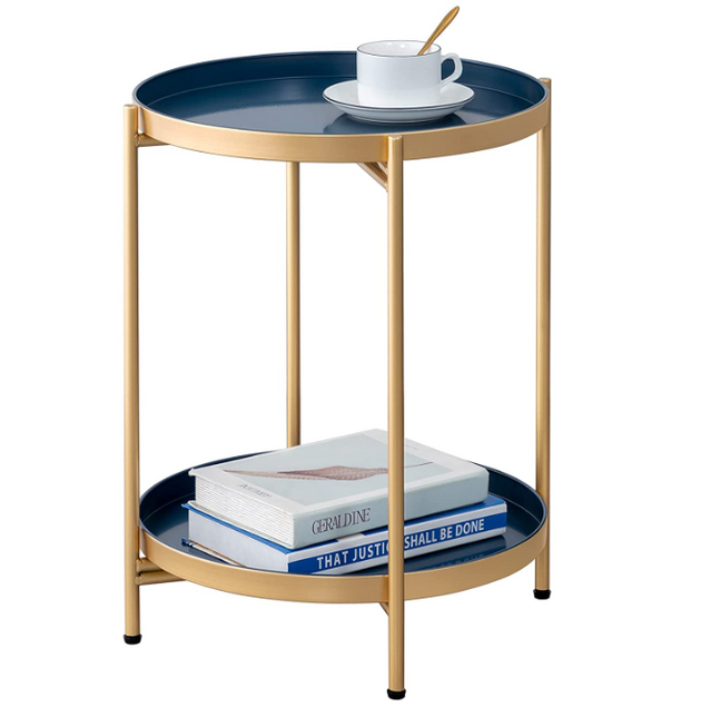 Folding End Table 2-Tier Metal Round Side Table with Removable Tray Gold + Blue