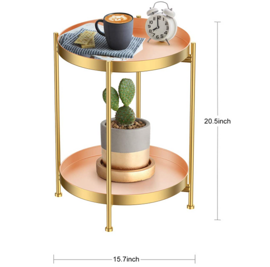 Folding End Table 2-Tier Metal Round Side Table with Removable Tray Gold + Pink
