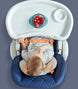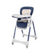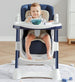 The high chair’s tray features a removable top layer for easy cleaning and access to stored toys.