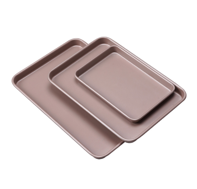 These non stick bakeware kit includes 3 sizes of cookie sheets pans. Dimensions are Small: 26*18*2.8cm, Medium: 34.5*25*2.8cm, Large: 39.5*28* 2.8cm, allowing you to make bulk batches of oven-baked goodies