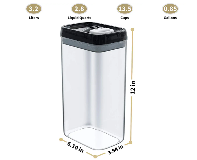 Give your kitchen or pantry a makeover with the stylish airtight food storage containers. It is 3.2 Liters of capacity (2.82 QT/ 13 Cups). You'll never have to worry about pantry storage.