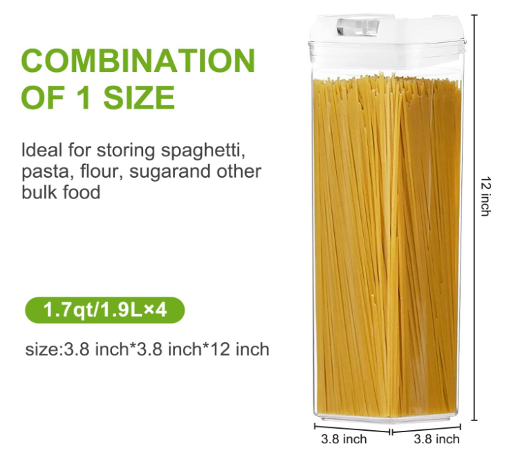 Perfect Combination: This kitchen organization set includes 4 tall air-tight containers, which are all the same size. Each One has a 1.9 liter capacity (1.7qt), measures 3.8 x 3.8 x 12 inch.
