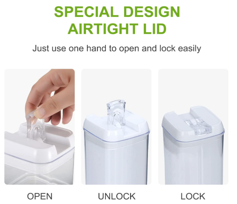 Airtight Seal Lids: the side-locking lids with silicone gasket make these storage containers airtight, and the top flips open easily. Airtight storage system will always keep your food dry and fresh, help you get prolonged food storage.
