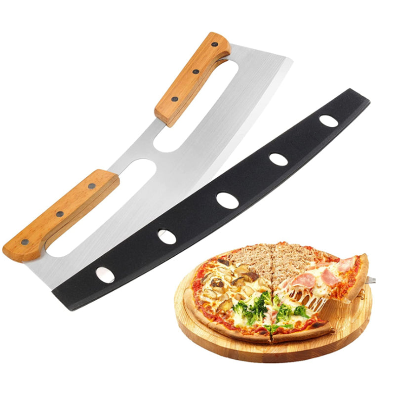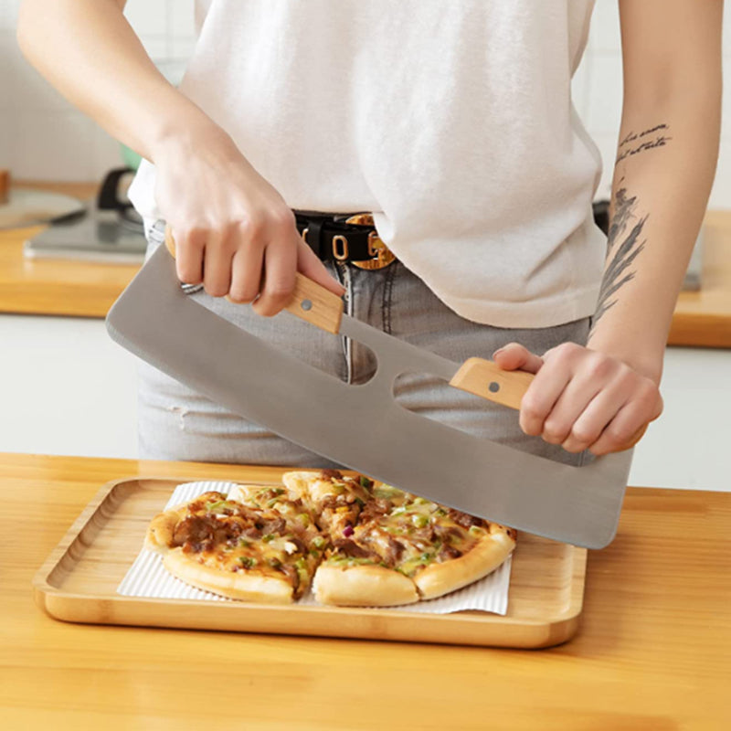 The pizza knife adopt the ergonomic double wood handle helps you cut pizza quickly and comfortably without causing any discomfort to your wrist, the unique double handles make it comfortable in hand and save strength.