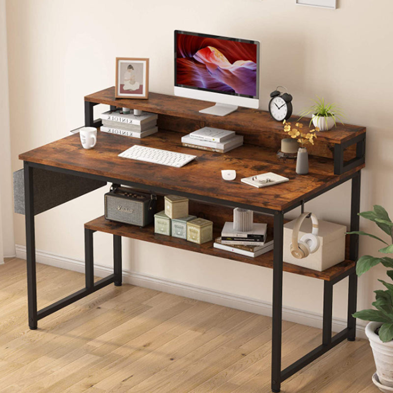 The computer desk with top shelves and the bottom bookshelf. It is a suitable workspace for your home office activities and provides ample space for computer, monitor, printer, writing, study, and other home office activities.